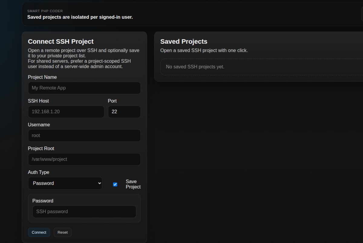 Smart PHP Coder redefines remote development. It allows you to connect directly to your server via SSH and work on your projects as if you were sitting in front of it. This means:
